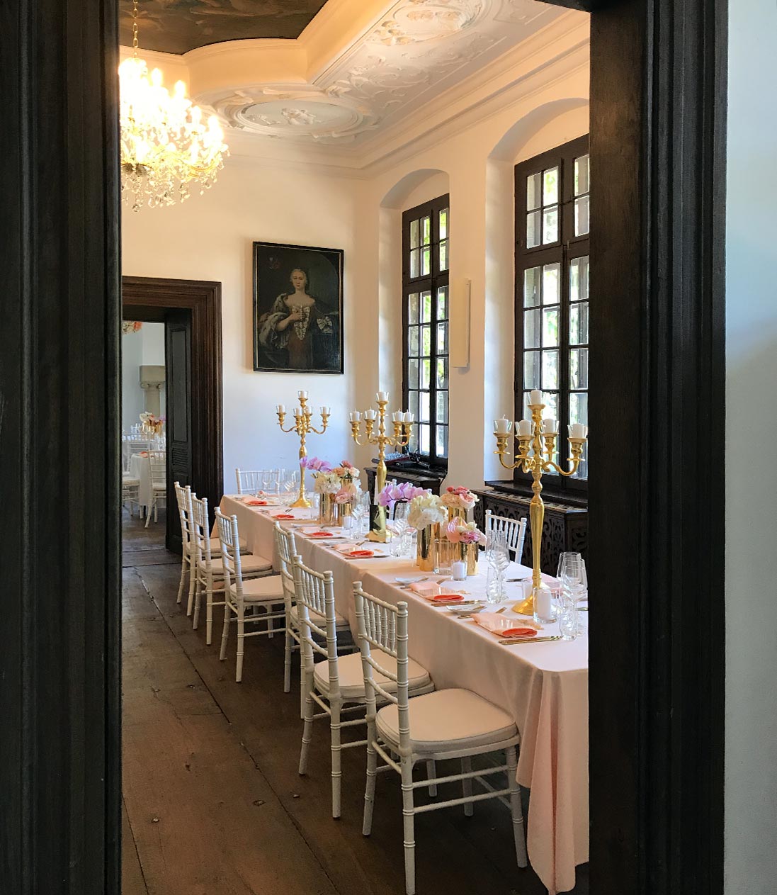 Wir bieten Ihnen die Möglichkeit, hier zu feiern, zu tagen und zu genießen. Individuell und fernab normaler Gastronomie. Das herrliche Wasserschlösschen, die helle Orangerie, die wunderschöne Kapelle sowie die Außenanlagen mit dem knorrigen alten Baumbestand und der umliegenden Gräfte können Sie mieten.